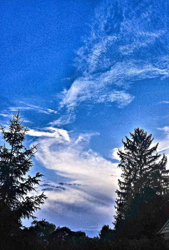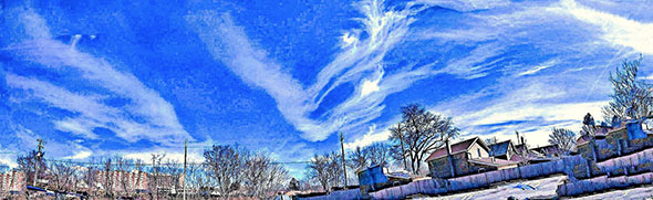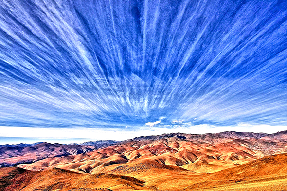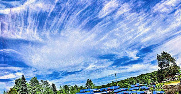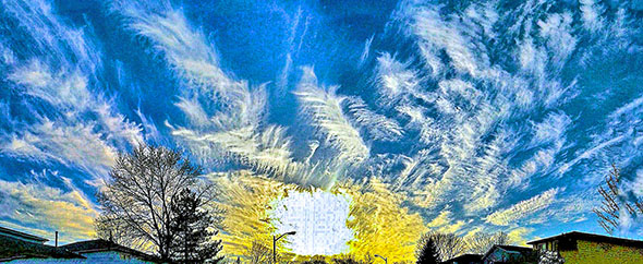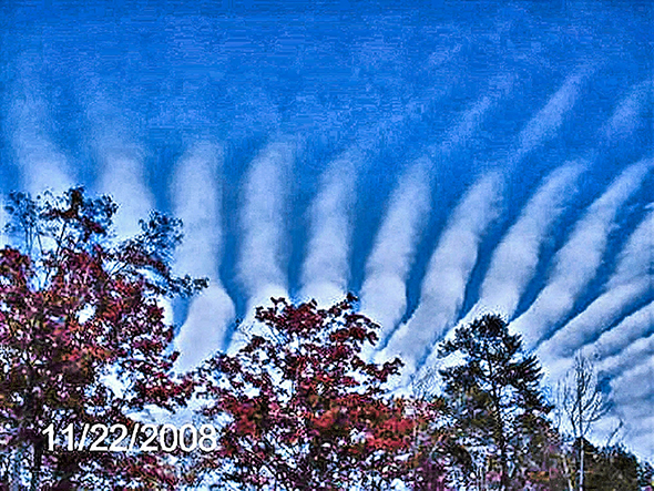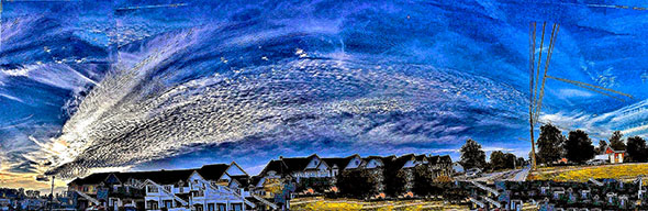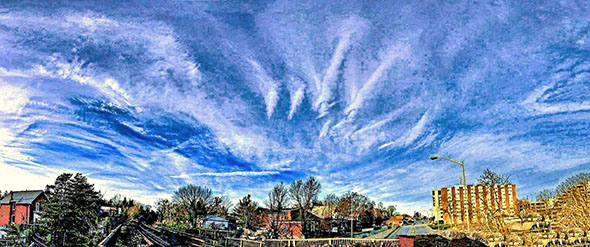 Photo Four - An example of one of the many specific types of Mother Ship Clouds, usually wide and horizontal. Notice that the bottoms of the Radial lines curve down around at the right end, suggesting that the Radials are from a cigar shaped Mother Ship. Regardless of type of Ship and type of Radionnic Cloud, Mother Ship tendrils tend to be thick.