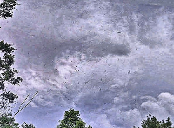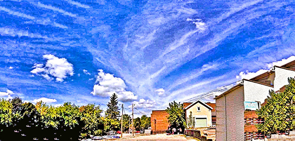 Photo Five - An example of one of the many specific different types of Father Ship Clouds, usually wide and horizontal. Notice the Saucer shaped Ship outline at the point of emanation. This Ship is very large, at least a couple of miles wide. Some cylinder shaped Mother and Father Ships can be up to ten miles long or longer. Not uncommonly, a Radionnic Mother Ship or Father Ship Cloud will cover the whole sky wall to wall like in this example. Anchor Ship clouds tend to stay put, sometimes sitting in the exact same place for weeks on end. Mother Ships and Father ships are considered to be Mobile, typically relocating frequently as needed. Regardless of the type of Father Ship and type of Radionnic Cloud produced, Father Ship tendrils tend to be wispy.