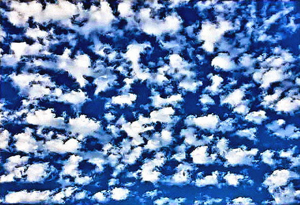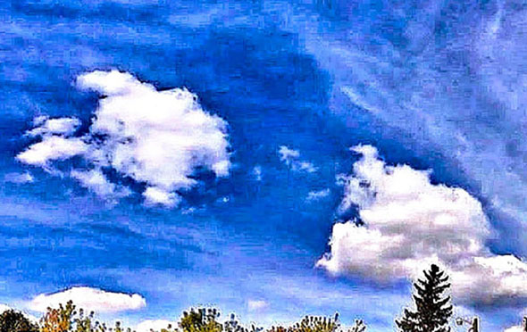 Likewise, the cloud formation in the photograph above is the unique Radionnic Field signature of another type of Radionnic Ship called Anchor Scout Ship. The Ships are called 'Anchor' because a Positive and Negative Anchor Ship pair will project down into the fourth dimension and set up an anchored pair of Radionnic Clouds sitting one hundred and eighty degrees opposite each other. Like the Mobile Ship pair above, the Anchor Ships always project as a Negative and Positive polarity pair. Their magnetic fields connect to each other through the fourth dimension creating the equivalent of a bar magnet anchored overhead. The example above is a Negative pole (upper center area filled in), the Cloud in Photo Two below is a Positive pole (upper center area empty).