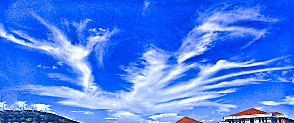 Photo Eighteen - Fourth Dimensional Sylphs are also involved in the process, helping by dissolving Chemtrails as they become laid down and diminishing the power of Man made hurricanes. The following Photo is of a a grand 'schooner of the skies' type Sylph, photographed in Kampala, Uganda. The neck and head are up the left, wings are in the middle and feet and tail are to the right. Sylphs are fourth dimensional Beings matrixed half way between Man and Animals. Sylphs have a magnetic presence similar to Radionnic Ships, which can likwise be quasi visible in the Clouds overhead in the same way that the Mobile Scout Ship condensates are quasi visible. Take a good look and think Chinese festival street Dragons.