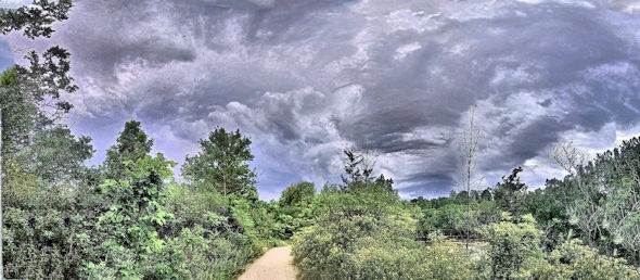 Photo Three - A panoramic view of a Negative Pole and Positive Pole together standing one hundred and eighty degrees opposite each other, showing unequivocally how the Radial lines going in and out of the one Radionnic Field become the Radial lines going in and out of the other. I,e, as a magnetic field, like a bar magnet. The Negative Pole cloud is on the left and the Positive Pole cloud on the right.